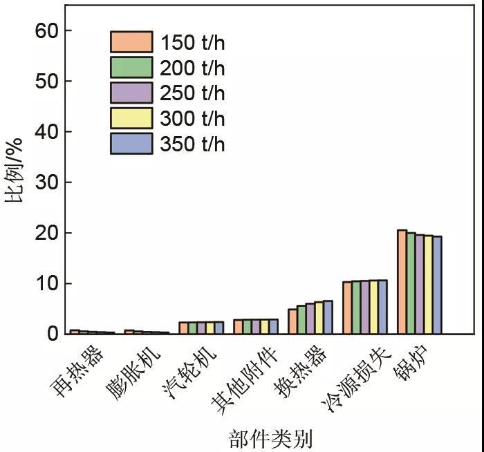 對(duì)比150、200、250、300、350 t/h抽汽量的集成系統(tǒng)強(qiáng)化供電階段基本點(diǎn)?分析,從圖16可以看出,各類部件?損失占輸入?的比例大小與強(qiáng)化供熱階段一致,鍋爐最大,冷源損失次之,分別為20%左右和10.5%左右。鍋爐的?損失最大,主要是由于燃燒損失以及換熱損失的不可逆性損失導(dǎo)致的。最小的是間熱器和膨脹機(jī)部件,均為0.5%左右。