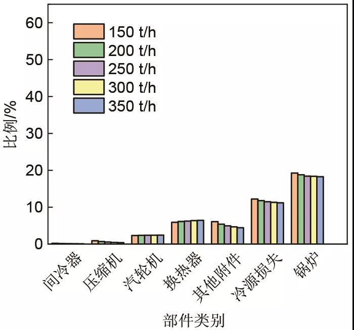 對(duì)比150、200、250、300、350 t/h抽汽量的集成系統(tǒng)強(qiáng)化供熱階段基本點(diǎn)?分析,從圖15可以得出,整個(gè)系統(tǒng)各部件?損失占輸入?的比例中,鍋爐部件最大,其次是冷源損失,最小的是壓縮空氣儲(chǔ)能子系統(tǒng)的間冷器和壓縮機(jī)部件。其中鍋爐?損失所占輸入?的比例在19.5%左右,且隨著抽汽量的增大有增加趨勢(shì);最小的間冷器和壓縮機(jī)部件?損失占輸入?的比例僅為0.45%左右。