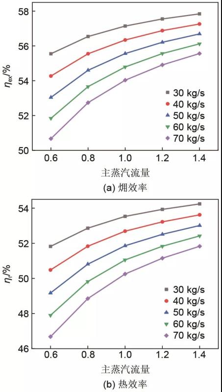 (2)隨著空氣流量從30 kg/s增大到70 kg/s,在強(qiáng)化供熱階段,熱電解耦指標(biāo)熱電比增大0.07~0.20左右;強(qiáng)化供電階段,熱電比減小0.14~0.28左右。隨著空氣流量的增大,在強(qiáng)化供熱和強(qiáng)化供電階段,熱電比隨主蒸汽流量的變化率均增大;對(duì)于某一特定的主蒸汽流量,集成系統(tǒng)性能隨空氣流量的變化規(guī)律,與基準(zhǔn)主蒸汽流量下的變化規(guī)律一致;