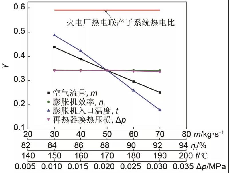 從圖7中可以看出,隨著進(jìn)入壓縮空氣儲(chǔ)能子系統(tǒng)壓縮機(jī)和膨脹機(jī)的空氣流量的增加,熱電比有所降低,這是由于集成系統(tǒng)強(qiáng)化供電階段隨著空氣流量的增加可以消耗掉更多熱電聯(lián)產(chǎn)機(jī)組的采暖抽汽,而與此同時(shí)膨脹機(jī)還產(chǎn)生更多的電能,最終導(dǎo)致熱電比隨著空氣流量的增加呈減小趨勢(shì)。隨著膨脹機(jī)效率從0.84增加到0.92的過程中,熱電比呈現(xiàn)降低趨勢(shì),這是因?yàn)殡S著膨脹機(jī)功率的升高,可以消耗掉更多的熱能和產(chǎn)生更多的電能,所以熱電比呈現(xiàn)減小趨勢(shì)。隨著膨脹機(jī)入口溫度和再熱器換熱壓損的增加,換熱損失有所增加,消耗的熱能有所增加,所以熱電比均呈現(xiàn)降低趨勢(shì)。
