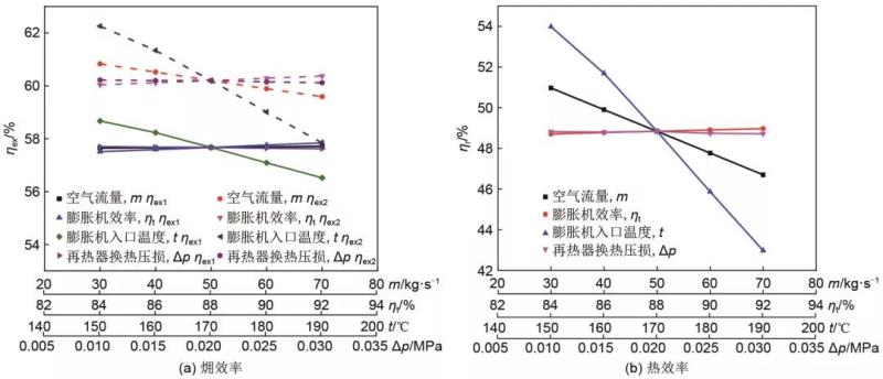 (3)總過程。從圖8中可以看出,由于換熱站換熱溫度不對(duì)等引起的換熱?損失,ηex1比ηex2小3%左右,采暖抽汽與用戶采暖溫度的差值會(huì)造成較大的能量損失。隨著進(jìn)入壓縮空氣儲(chǔ)能子系統(tǒng)壓縮機(jī)和膨脹機(jī)的空氣流量的增加,集成系統(tǒng)總過程的?效率呈現(xiàn)逐步減小的趨勢(shì),當(dāng)空氣流量從30 kg/s增加到70 kg/s時(shí),總過程的?效率從56.3%減小到52.2%;熱效率從50.4%減小至43.2%。這是因?yàn)殡S著空氣流量的增加,有更多的電能完成從電能到熱能再到電能的轉(zhuǎn)化,即能量品位從高到低再到高,造成了能量的浪費(fèi),所以總過程?效率和熱效率呈現(xiàn)減小趨勢(shì)。當(dāng)壓縮空氣儲(chǔ)能子系統(tǒng)的壓縮機(jī)效率從0.82增加到0.90時(shí),總過程?效率增加0.4%;熱效率幾乎不變。這是由于當(dāng)壓縮機(jī)效率提高時(shí),壓縮機(jī)的耗功會(huì)相應(yīng)降低,即高品位的電能向低品位的熱能轉(zhuǎn)化的量減少,從而導(dǎo)致總過程?效率增加。當(dāng)壓縮空氣儲(chǔ)能子系統(tǒng)的膨脹機(jī)效率從0.84增加到0.92時(shí),總過程的?效率增加0.35%,熱效率增加0.2%。原因是膨脹機(jī)效率的提高,會(huì)有更多的熱能轉(zhuǎn)化為電能,能量品位得以提升,故總過程的?效率和熱效率呈現(xiàn)增加態(tài)勢(shì)。膨脹機(jī)入口溫度從150 ℃增加至190 ℃時(shí),總過程?效率降低2.2%;當(dāng)改變間冷器和再熱器兩端的換熱壓損使其從0.01 MPa增加到0.03 MPa時(shí),總過程?效率在54.2%左右,熱效率在46.6%左右;這是因?yàn)閾Q熱損失隨之增加,但由于其影響較小,故總過程的?效率輕微減小,幾乎沒有影響。