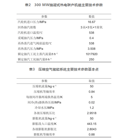 在搭建新型集成系統(tǒng)模型時(shí),對(duì)于火電廠抽凝式熱電聯(lián)產(chǎn)機(jī)組和壓縮空氣儲(chǔ)能子系統(tǒng)的模型搭建,采取的主要技術(shù)參數(shù)見表2、表3。
