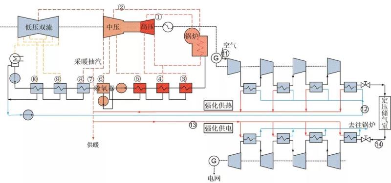本文提出一種熱電聯(lián)產(chǎn)機(jī)組與壓縮空氣儲(chǔ)能集成的新系統(tǒng),即在壓縮空氣儲(chǔ)能系統(tǒng)的基礎(chǔ)上,利用壓縮過程產(chǎn)生的壓縮熱來提供熱負(fù)荷,并引入熱電聯(lián)產(chǎn)機(jī)組汽輪機(jī)中壓缸末級(jí)采暖抽汽來加熱膨脹機(jī)入口空氣,以實(shí)現(xiàn)能源的高效利用。其中,熱電聯(lián)產(chǎn)機(jī)組采用中間再熱抽凝式機(jī)組,回?zé)岢槠?jí)數(shù)采用三高三低一除氧;壓縮空氣儲(chǔ)能系統(tǒng)采用四級(jí)壓縮和四級(jí)膨脹,為定壓壓縮空氣儲(chǔ)能系統(tǒng)形式,利用水的靜壓實(shí)現(xiàn)儲(chǔ)氣室壓力的恒定。圖1為該新型熱電聯(lián)供系統(tǒng)流程。