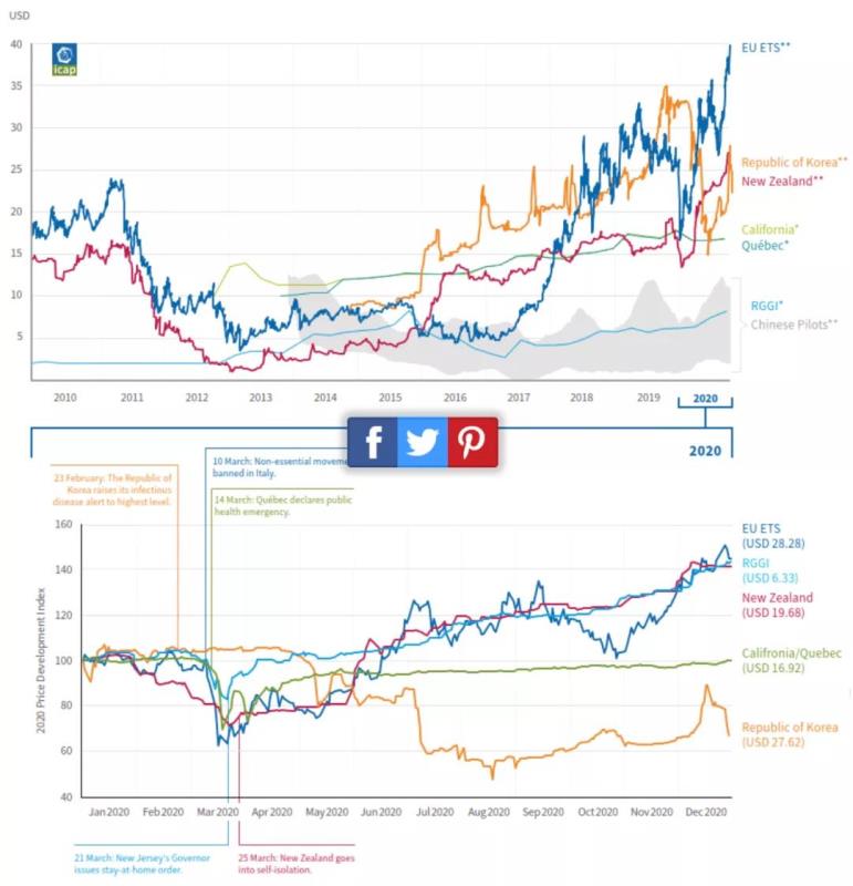 新冠病毒大流行預(yù)示著另一場(chǎng)長(zhǎng)期而深刻的經(jīng)濟(jì)衰退,人們可能擔(dān)心碳市場(chǎng)再次受到?jīng)_擊。幸運(yùn)的是,看來(lái)這次會(huì)有所不同。我們看到了明顯的跡象,表明新冠疫情的經(jīng)濟(jì)影響不會(huì)長(zhǎng)期拖累碳市場(chǎng)的有效性。在歐盟,2020年底的碳價(jià)比年初高出45%;在新西蘭增長(zhǎng)了41%;北美區(qū)域上漲了43%,而美國(guó)加州和加拿大魁北克的碳市場(chǎng)價(jià)格恢復(fù)到疫情大流行前的水平。
