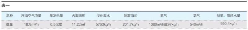 通過曲管換熱器中海水量(液面高度)的調(diào)整,可以在換熱器氣流出口得到需要的氣流溫度,將氣流引入房間即可獲得空調(diào)制冷與制熱的效果。蒸餾淡水除生活飲用等外,一部分引入電解槽,利用海上電站自身電力電解水,可在陰極得到氫氣,陽極得到氧氣,海上電站產(chǎn)品為清潔電力、制冷、制熱、淡化海水、海鹽、氫氣、氧氣。以6000kw海上電站為例估算海上電站參數(shù)及產(chǎn)品產(chǎn)量(如表一所示)。