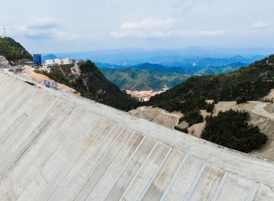 梅蓄電站是梅州歷史上投資最大的基建工程。上水庫工程包括主壩、副壩、溢洪道、進(jìn)出水口、導(dǎo)流洞等建筑物,主壩為鋼筋混凝土堆石壩,壩頂高程820米,最大壩高60米,壩頂頂長500米,進(jìn)出水口位于大壩上游側(cè)。上水庫主體工程于2018年9月開工建設(shè),2019年7月導(dǎo)流洞截流,2019年9月上水庫主壩開始填筑,2020年9月主壩填筑封頂,2020年12月開始面板澆筑,2021年2月面板澆筑完成。