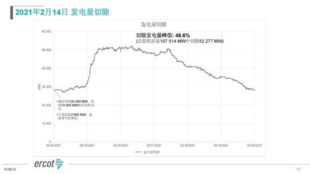 得州的電力結(jié)構(gòu)目前75%的電力來自于天然氣(51%)和風(fēng)能(24%),剩余的13%來自與燃煤,核能,太陽能以及其他的發(fā)電來源分別大約占5%,4%,和2%。在暴風(fēng)雪期間,得州的所有發(fā)電能源,包括風(fēng)能和太陽能,與燃煤,天然氣,核能均受到當(dāng)?shù)乇╋L(fēng)雪的影響,能源系統(tǒng)被凍結(jié)而發(fā)電廠設(shè)施無法運(yùn)行。其中,由于結(jié)冰或凍結(jié),天然氣輸送管道和天然氣井的故障而無法獲得管道氣,約30,000兆瓦的發(fā)電量或足以滿足得州的40%,45%高峰需求的電力在星期一的晚上因受損脫網(wǎng)。與此同時,風(fēng)電機(jī)組設(shè)備結(jié)冰,無法正常運(yùn)行的機(jī)組超過總裝機(jī)的三分之一(有報道稱雖風(fēng)電出力低于常規(guī)時段,但在極端天氣下的最高負(fù)荷時段出力卻高于預(yù)期)。南得州核能發(fā)電站的一條輸水管凍結(jié),導(dǎo)致一座核反應(yīng)堆無法運(yùn)營。