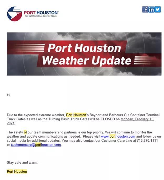 孟靜惟:2月12日下午,工作原因收到了休斯頓港口周一停運(yùn)的郵件,一批物資正卡在港口,焦頭爛額調(diào)整生產(chǎn)計劃擔(dān)心物資短缺。下班時間收到通知需要帶上工作電腦回家以防周一有雪可在家辦公。