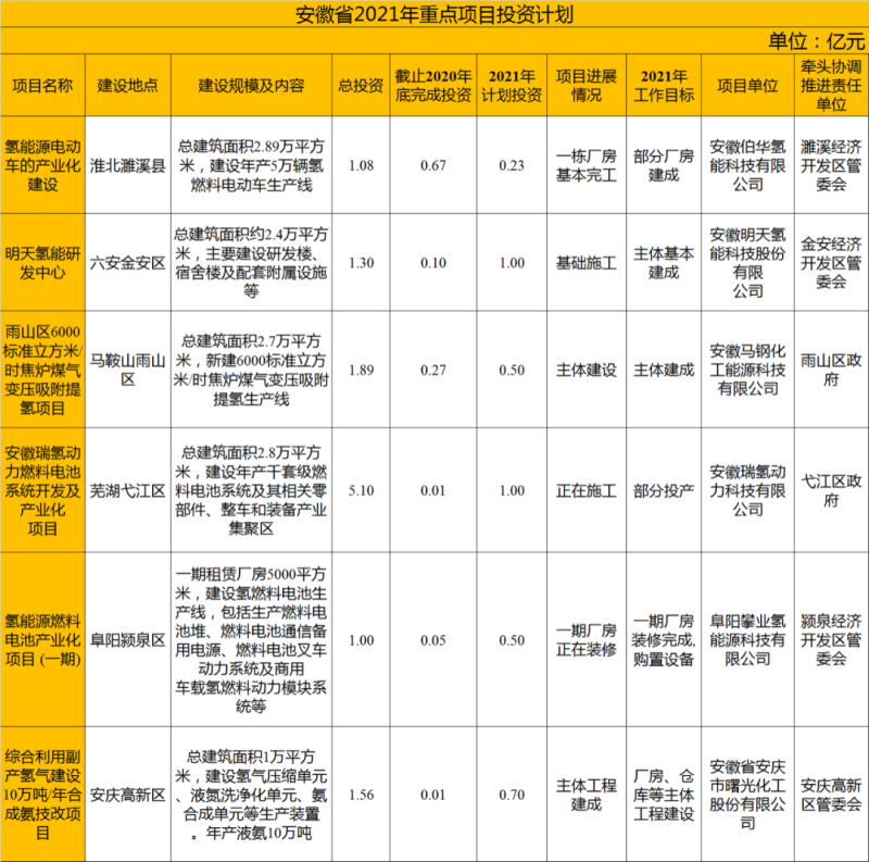 在此次安徽省公布的《2021年重點項目投資計劃》項目清單中,共有6個氫能與燃料電池項目入選,均屬于戰(zhàn)略性新興產業(yè),總投資11.93億元,其中2021年計劃完成投資3.93億元。
