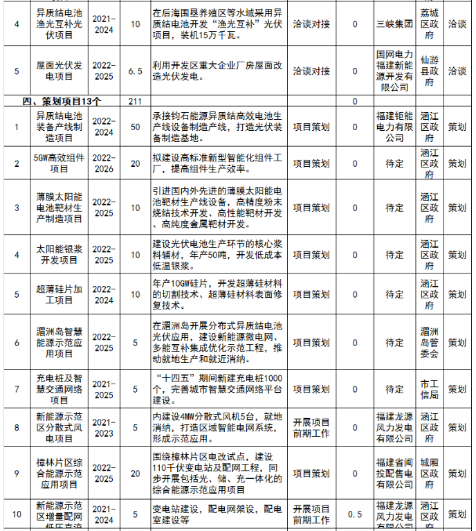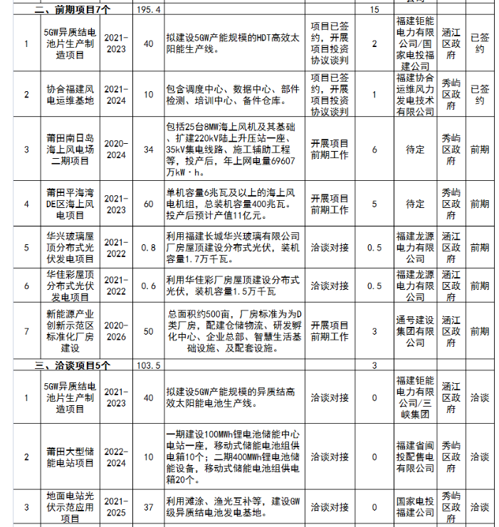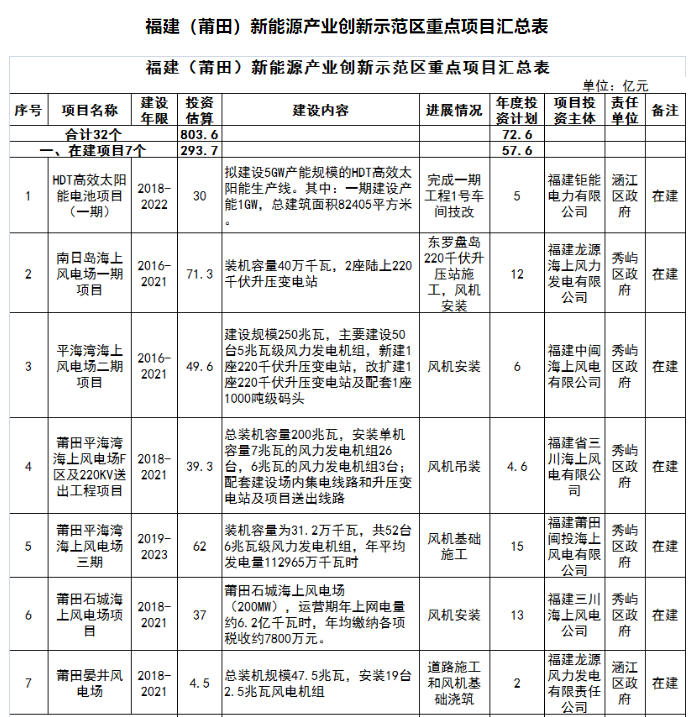 福建(莆田)新能源產(chǎn)業(yè)創(chuàng)新示范區(qū)重點(diǎn)項(xiàng)目匯總表
