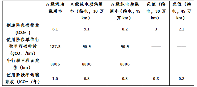 另外,換電模式下,動(dòng)力蓄電池利用率較高,將A級純電動(dòng)汽車減排滯后期降低到2年~4年(如下表所示),即A級純電動(dòng)汽車使用2年~4年即可抵消其生產(chǎn)階段較A級汽油車高出的碳排放。