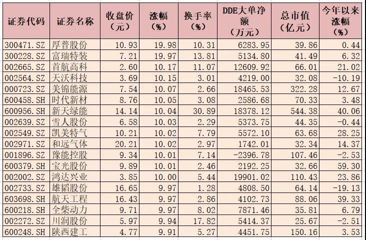 表:4月6日18只漲停氫能源概念股一覽