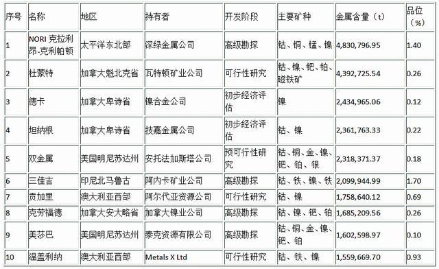 在十大鎳礦項(xiàng)目中,NORI克拉利昂-克利帕頓、三佳吉、克勞福德和美莎巴這4個(gè)項(xiàng)目正處于高級(jí)勘探階段。加拿大不列顛的2個(gè)項(xiàng)目已進(jìn)入初步經(jīng)濟(jì)評(píng)估(PEA)階段;其余項(xiàng)目處于預(yù)可行性研究(PFS)或可行性研究(FS)階段。