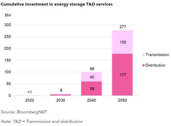 中國儲能網(wǎng)訊:由于電池成本的下降,電池存儲項目相對于新的輸電項目更具競爭力。彭博社新能源預(yù)計,提供輸配電服務(wù)的儲能項目在2020年至2050年之間的市場規(guī)模將達到2770億美元。