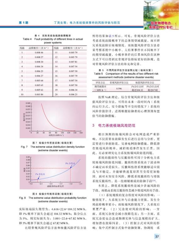 摘要:傳統(tǒng)電力系統(tǒng)風(fēng)險評估方法以普通風(fēng)險為研究對象,無法體現(xiàn)極端事件對系統(tǒng)運行帶來的破壞性影響?;诮鹑陬I(lǐng)域風(fēng)險價值理論,提出一種電力系統(tǒng)極端風(fēng)險評估與量化方法,對傳統(tǒng)風(fēng)險評估方法進行補充和完善。采用極值風(fēng)險評估方法,著重考察極端事件對系統(tǒng)穩(wěn)定運行造成的影響,體現(xiàn)了小概率極端事件對系統(tǒng)穩(wěn)定造成的嚴(yán)重后果。基于電力系統(tǒng)網(wǎng)絡(luò)攻擊事件和極端災(zāi)害事件進行極端風(fēng)險評估,對比常規(guī)風(fēng)險與極值風(fēng)險評估結(jié)果,驗證了所提的極端風(fēng)險評估方法的合理性。同時,基于電力系統(tǒng)脆弱性與反脆弱性特征,提出極端風(fēng)險防范的關(guān)鍵難點在于如何協(xié)調(diào)普通風(fēng)險與極端風(fēng)險。