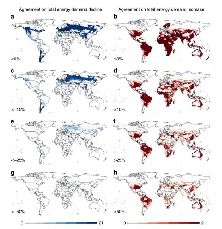 該研究使用計量經濟的方法評估能源需求與人均收入、冷熱天數(shù)的響應,考慮2050年左右的平均氣溫的上升,推算出全球變暖使得全球能源需求在2050年左右增加了25-58%(在較溫和的溫升情況下也會增加11-27%),而能源需求由于社會經濟、人口發(fā)展本身到2050年也將增長1.7-2.8倍。在美國,歐洲和中國的熱帶和南部地區(qū)的能源需求將因為氣候變暖增長超過25%。