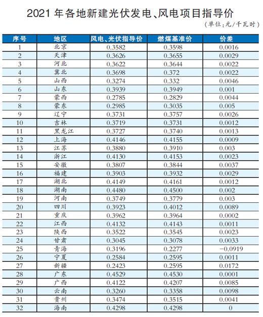 征求意見(jiàn)稿指出,2021年,新建項(xiàng)目保障收購(gòu)小時(shí)數(shù)以內(nèi)的發(fā)電量,上網(wǎng)電價(jià)繼續(xù)按“指導(dǎo)價(jià)+競(jìng)爭(zhēng)性配置”方式形成。其中,指導(dǎo)價(jià)統(tǒng)籌考慮2020年各地燃煤發(fā)電基準(zhǔn)價(jià)和市場(chǎng)交易平均價(jià)分省確定。根據(jù)征求意見(jiàn)稿,最高指導(dǎo)價(jià)出現(xiàn)在廣東省,為0.4529元/千瓦時(shí);最低指導(dǎo)價(jià)出現(xiàn)在新疆,為0.2423元/千瓦時(shí)。