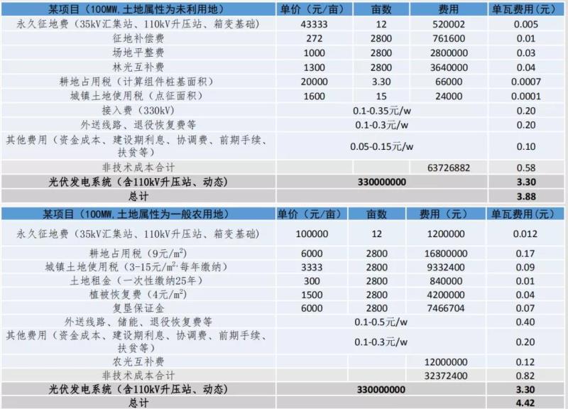 關于土地的成本,除了租金,還有耕地占用稅、城鎮(zhèn)土地使用稅以及青苗補償、場地平整、復墾費等眾多細項。西勘院總圖所所長惠星一份測算數(shù)據顯示,建設在未利用地、一般農田的某100MW光伏電站項目,非技術成本占比達到了15%-19%。除了土地之外,電網接入也是非技術成本中占比最高的一個部分。