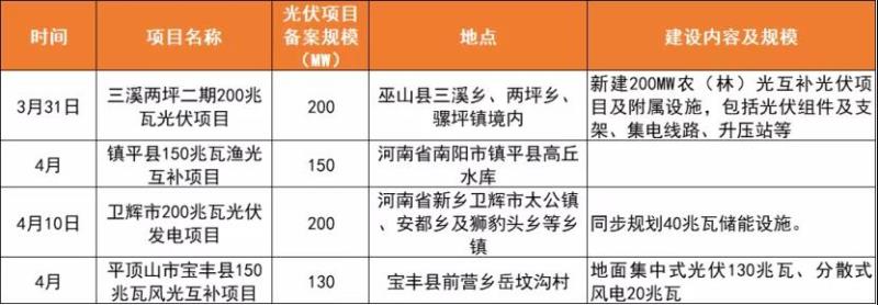 據(jù)三峽新能源官方消息,近日,三峽新能源于河南、重慶備案680MW項(xiàng)目,涉及農(nóng)(林)光、漁光、風(fēng)光互補(bǔ)等多種形式。光伏們整理了公示的備案項(xiàng)目情況,如下所示: