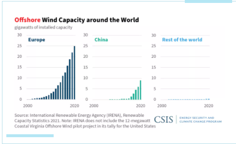 到2020年底,美國海上風電裝機容量僅占世界的0.1%(而陸上風電裝機容量僅占17%),遠遠落后于中國和歐洲國家。