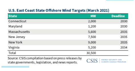 盡管目前還沒有大型項目開工建設,但有美國幾個東部州正爭先恐后地設定雄心勃勃的目標。紐約以2035年9吉瓦的目標領先;新澤西州以7.5吉瓦的目標緊隨其后,馬薩諸塞州的目標是5.6吉瓦,這些州一級的目標加在一起,已經略高于拜登宣布的2030年30吉瓦的目標。