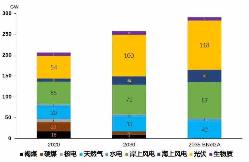 在2021年修訂的可再生能源法案中,德國制定目標(biāo),2030年光伏裝機(jī)要達(dá)到100GW,海上風(fēng)電和岸上風(fēng)電分別達(dá)到20GW和71GW。德國聯(lián)邦網(wǎng)絡(luò)管理局在年初發(fā)布的2035電網(wǎng)規(guī)劃草稿中,預(yù)期煤電完全退出,風(fēng)電和光伏裝機(jī)量繼續(xù)增長,同時(shí)也規(guī)劃了一定的儲能和氫能。