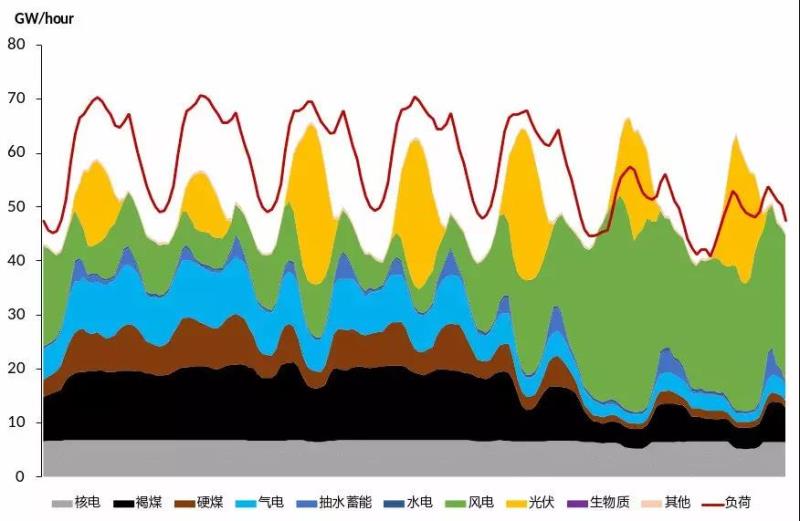 圖6 2021年3月22日至28日每小時(shí)德國發(fā)電電源結(jié)構(gòu)(GW)