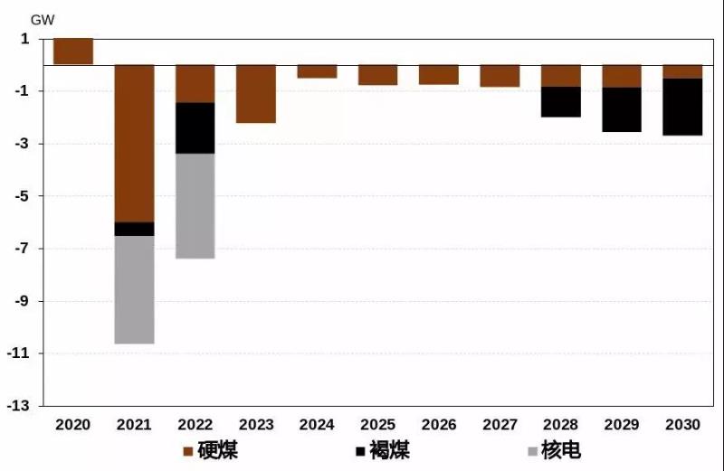 圖5 2020至2030年德國煤電和核電機(jī)組容量變化(GW)