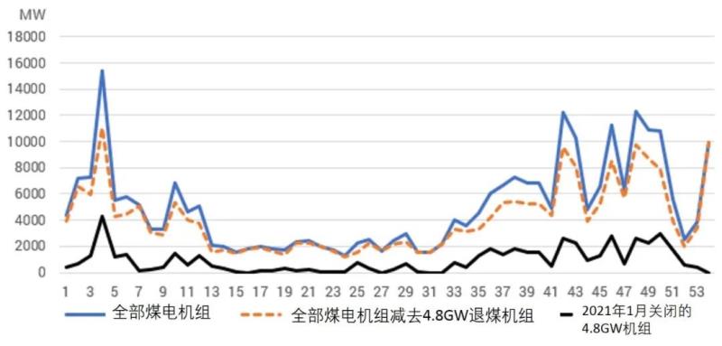 北歐電力分析機(jī)構(gòu)EnergyQuantified估算,年初關(guān)停4.8GW煤電,使得德國日前電價(jià)峰值上漲約10歐元/MWh。圖4顯示了2020年第1至53周德國煤電機(jī)組運(yùn)行容量的變化,藍(lán)色線為全部機(jī)組,黑色線則為2021年關(guān)閉的第一批4.8GW煤電機(jī)組。可以看出,在2020年的高峰時(shí)段,這些機(jī)組最高供應(yīng)了4GW的電力,一半時(shí)段有2GW在運(yùn)行,只有第二三季度的運(yùn)行容量較低。也就是說,2021年初寒潮推高德國用電負(fù)荷的時(shí)段,這些被關(guān)閉的煤電機(jī)組原本可以提供2-4GW的電力,但是現(xiàn)在只能由成本更高的機(jī)組來填補(bǔ)缺口,所以使得峰值電價(jià)更高。