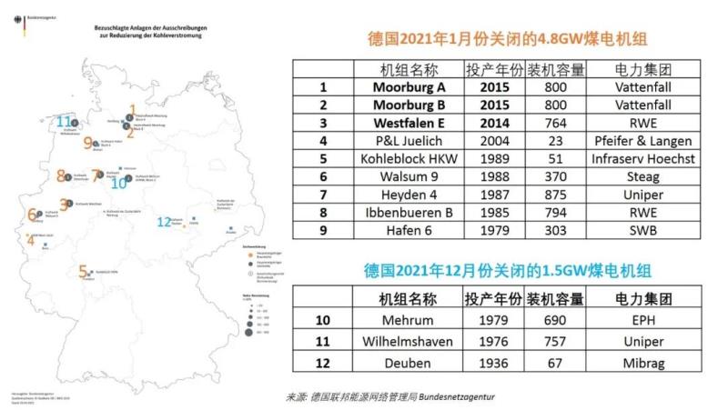 圖1 德國2021年1月份和12月份分別關(guān)閉的4.8GW和1.5GW煤電機(jī)組名單