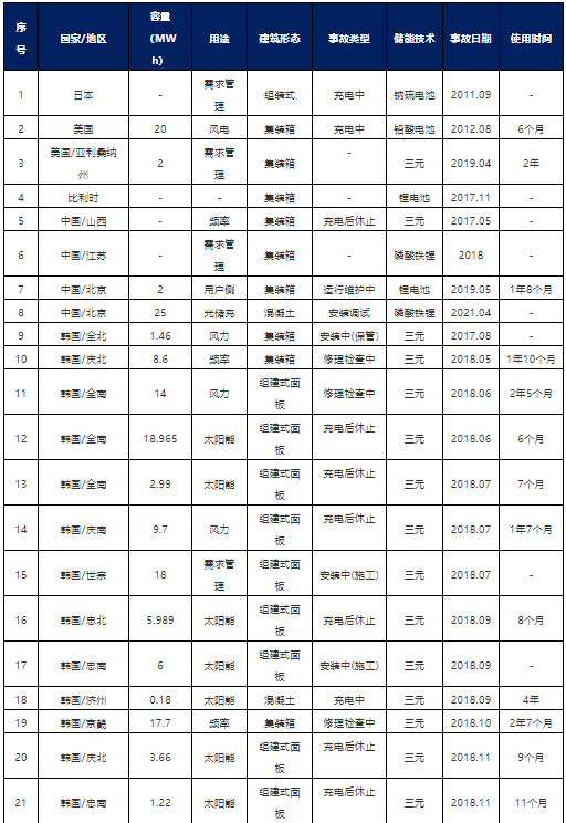 通過(guò)對(duì)行業(yè)公開(kāi)信息進(jìn)行搜集整理,匯總了2011-2021年間,全球儲(chǔ)能項(xiàng)目主要火災(zāi)或爆炸事故。由于較多安全事故原因復(fù)雜,相關(guān)事件很多都未公開(kāi)披露,據(jù)不完全統(tǒng)計(jì),近10年間,全球共發(fā)生32起儲(chǔ)能電站起火爆炸事故。其中,日本1起、美國(guó)2起、比利時(shí)1起、中國(guó)3起、韓國(guó)24起。