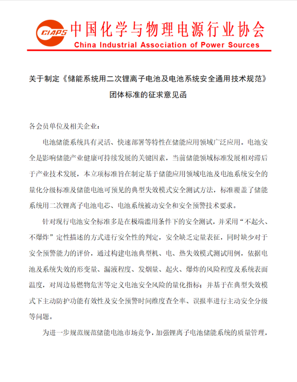 為進一步規(guī)范規(guī)范儲能電池市場競爭,加強鋰離子電池儲能系統(tǒng)的質(zhì)量管理,引導(dǎo)儲能產(chǎn)業(yè)電池安全技術(shù)升級,電池儲能系統(tǒng)在設(shè)計、選型、驗證有標(biāo)準(zhǔn)可依,推動電池儲能系統(tǒng)健康發(fā)展。中國化學(xué)與物理電源行業(yè)協(xié)會擬啟動《儲能系統(tǒng)用二次鋰離子電池及電池系統(tǒng)安全通用技術(shù)規(guī)范》協(xié)會團體標(biāo)準(zhǔn)編制工作。