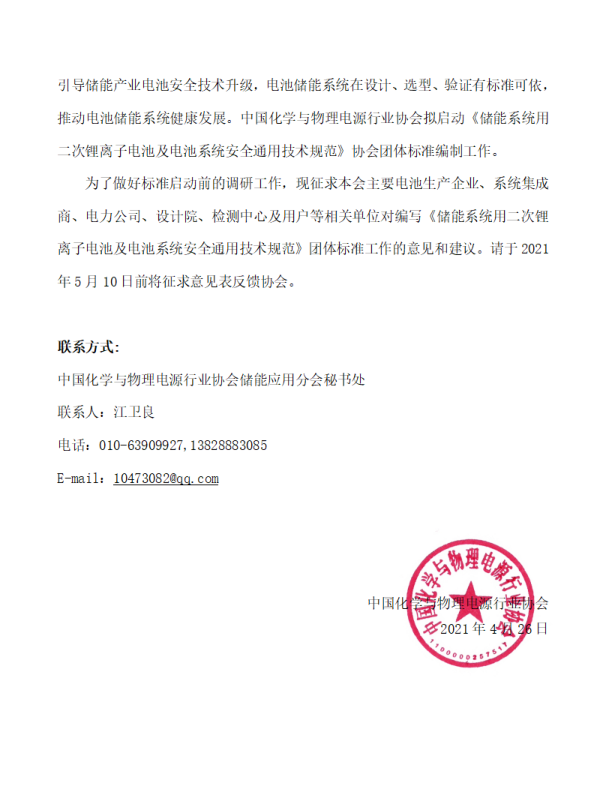 為了做好標(biāo)準(zhǔn)啟動前的調(diào)研工作,現(xiàn)征求本會主要電池生產(chǎn)企業(yè)、系統(tǒng)集成商、電力公司、設(shè)計院、檢測中心及用戶等相關(guān)單位對編寫《儲能系統(tǒng)用二次鋰離子電池及電池系統(tǒng)安全通用技術(shù)規(guī)范》團體標(biāo)準(zhǔn)工作的意見和建議。請于2021年5月10日前將征求意見表反饋協(xié)會。