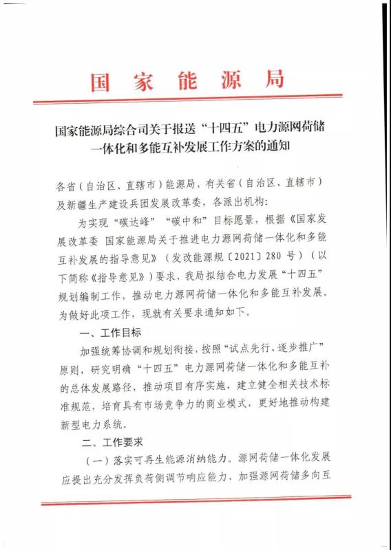 中國儲能網(wǎng)訊:4月25日,國家能源局綜合司向各省市發(fā)改委及能源局印發(fā)《關(guān)于報送“十四五”電力源網(wǎng)荷儲一體化和多能互補(bǔ)工作方案的通知》,就“碳達(dá)峰”、“碳中和”目標(biāo)下推動電力源網(wǎng)荷儲一體化和多能互補(bǔ)發(fā)布給出指導(dǎo)意見。