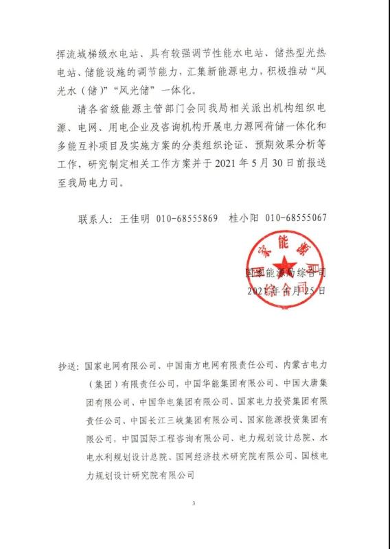 各省級能源主管部門應(yīng)積極開展電力源網(wǎng)荷儲一體化和多能互補(bǔ)項目及實施方案的分類組織論證、預(yù)期效果分析等工作,研究制定相關(guān)工作方案并于2021年5月0日前報送至能源局電力司。