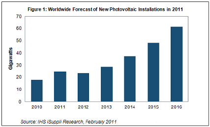 2010年全球光伏市場(chǎng)劇增146%。但今年將結(jié)束快速增長(zhǎng)的勢(shì)頭,預(yù)計(jì)今年太陽(yáng)能安裝將下降6%至23.3GW。由于面臨預(yù)算困難和政治壓力,許多國(guó)家的政府預(yù)計(jì)會(huì)削減上網(wǎng)電價(jià)補(bǔ)貼和減少對(duì)光伏產(chǎn)業(yè)的支持,這將削減建造商和投資者的熱情。但2012年以后,光伏產(chǎn)業(yè)仍具有可觀的潛力,在新興地區(qū)繼續(xù)增長(zhǎng),2016年全球新安裝容量預(yù)計(jì)將升到61.3GW,如圖1所示。