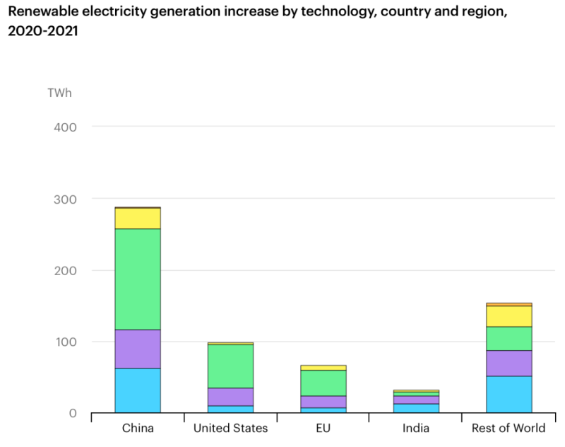 國(guó)際能源署預(yù)測(cè)2021年全球可再生能源發(fā)電量將增長(zhǎng)8%以上,達(dá)到8300太瓦時(shí),這是自1970年代以來(lái)的最快同比增長(zhǎng)。太陽(yáng)能光伏和風(fēng)能將占可再生能源發(fā)電量增長(zhǎng)的三分之二。2021年全球可再生能源電力增長(zhǎng)量中,僅中國(guó)就將占到近一半,其次是美國(guó)、歐盟和印度。