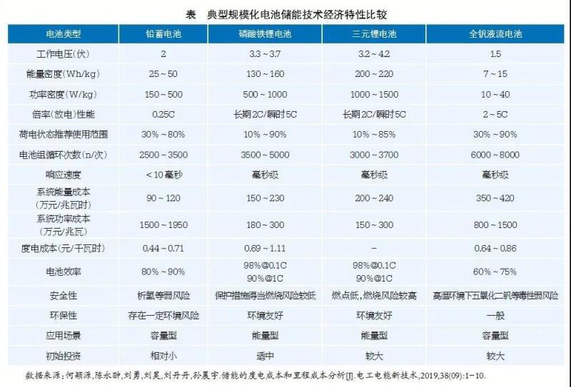 電化學儲能主要包括鉛蓄電池、鋰離子電池、液流電池、鈉硫電池等。目前用于規(guī)模化儲能的電池主要以鉛蓄、鋰離子和全釩液流電池為主,這三類典型規(guī)模化儲能電池的技術經(jīng)濟特性如表所示。從表中各項指標的綜合比較可以得出各電池技術參數(shù)的優(yōu)劣勢。綜合各項指標數(shù)據(jù)來看,磷酸鐵鋰電池相對更優(yōu),是當前我國電池儲能技術推廣應用的主流技術。此外,相比較抽水蓄能等其他儲能方式,電池儲能電站具有以下五個方面的優(yōu)勢:第一,設計靈活、配置方便,采用模塊化設計,基本上不受地理條件的限制;第二,響應速度快,毫秒級時間尺度內實現(xiàn)額定功率范圍內的有功無功的輸入和輸出;第三,精準控制,能夠在可調范圍內的任何功率點保持穩(wěn)定輸出;第四,具有雙向調節(jié)能力,既可以充電作為用電負荷,又可以放電作為電源,具有額定功率雙倍的調節(jié)能力;第五,電池儲能電站技術相對成熟,建設周期短,能夠快速響應應用需求。正是由于電池儲能技術具有上述優(yōu)勢,使得其廣泛應用于配合平抑新能源出力波動、提高電能質量、削峰填谷、調峰調頻、提高供電能力、提高孤立電網(wǎng)穩(wěn)定性及作為應急備用電源提供供電可靠性等多個方面。