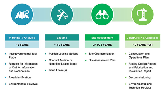 BOEM提供了海上風(fēng)電開發(fā)的具體流程【16】。首先,開發(fā)商必須在BOEM拍賣中獲得租賃權(quán)。接下來,BOEM將批準(zhǔn)開發(fā)人員的現(xiàn)場評估計劃,包括將如何進(jìn)行資源評估和測試技術(shù)等。最后,開發(fā)人員必須提交一份施工和運(yùn)營計劃,詳細(xì)說明了該項目計劃的所有施工和活動,包括退役計劃。BOEM還會按照《國家環(huán)境政策法》的要求執(zhí)行環(huán)境影響聲明,只有通過環(huán)境審查后才能得到環(huán)保局的批準(zhǔn),開發(fā)商才可以開始施工。