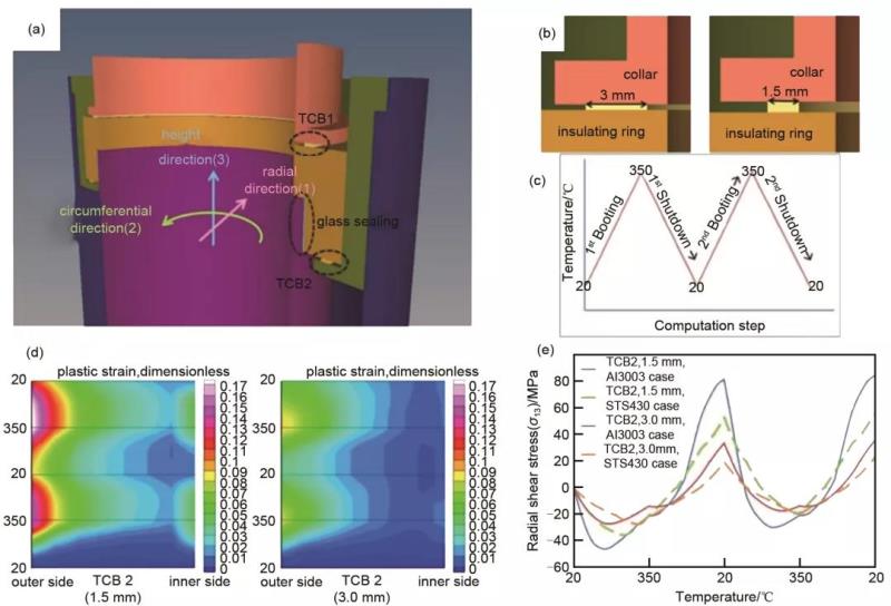圖13 熱震條件下TCB封接處的熱機(jī)械應(yīng)力計(jì)算的模型參數(shù)(a~c)以及徑向剪切應(yīng)力和塑性形變量分布的計(jì)算結(jié)果(d,e)