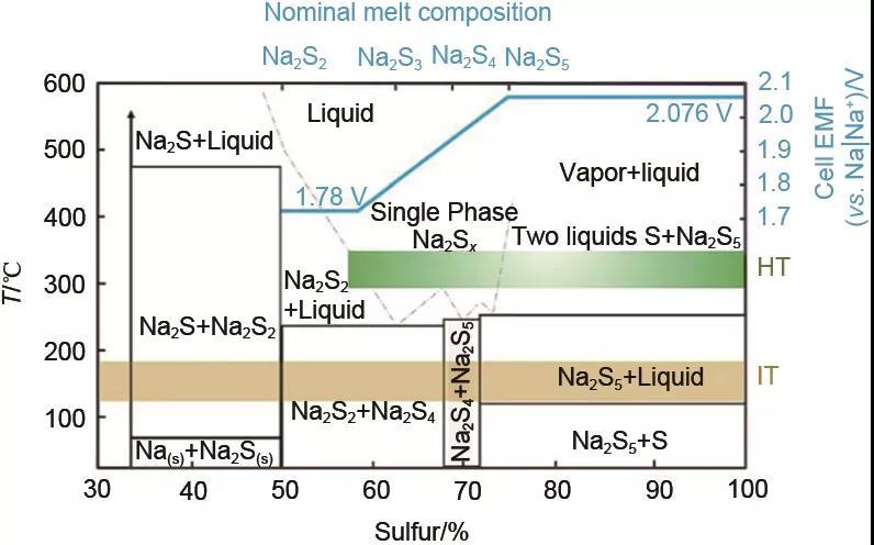 鈉硫電池的工作溫度控制在300~350 ℃,此時(shí)鈉與硫均呈液態(tài),β"-Al2O3具有高的離子電導(dǎo)率(約0.2 S/cm),電池具有快速的充放電反應(yīng)動(dòng)力學(xué)。理解鈉硫電池的工作溫度是重要的。圖3顯示了Na2Sx的相圖,圖中上部藍(lán)色曲線為電池300 ℃下的理論放電曲線,虛線對應(yīng)了不同放電深度反應(yīng)產(chǎn)物的熔點(diǎn)。Na2S4作為正極主要放電產(chǎn)物,其熔點(diǎn)為290 ℃,因此工作溫度降低不僅影響固體電解質(zhì)β"-Al2O3的鈉離子導(dǎo)電性,還會(huì)造成放電深度降低。溫度高于400 ℃時(shí),正極熔體氣化導(dǎo)致電池內(nèi)壓上升,影響電池安全運(yùn)行。
