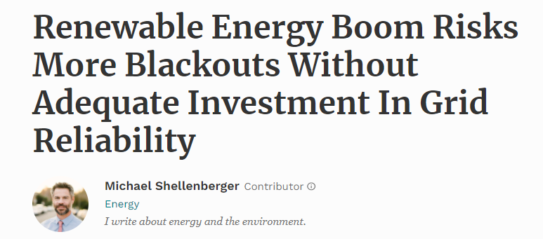 《福布斯》雜志網(wǎng)站發(fā)表能源專家Michael Shellenberger 的文章,題目是:Renewable Energy Boom Risks More Blackouts Without Adequate Investment In Grid Reliability(如果電網(wǎng)可靠性投資不足,可再生能源躍進(jìn)可能會(huì)出現(xiàn)更多停電風(fēng)險(xiǎn))