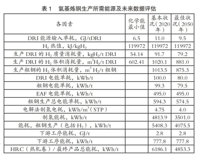 這是整個煉鋼生產中能耗最大的工序。對于目前的現代化直接還原廠,假定DRI生產工藝的能耗為11GJ/t。根據這個值,計算每噸DRI的氣體消耗(SGR)為1020.12m3H2(STP)/t。根據鐵礦石的質量不同,每噸粗鋼需要投入DRI大約為1150kg,也使SGR的消耗量提高至1177m3H2(STP)/t粗鋼。如果加入廢鋼(如在BF-BOF工藝中),SGR的噸鋼消耗量也會隨廢鋼的加入量而變化。在這種情況下,為了比較傳統(tǒng)的BF-BOF工藝和直接還原煉鋼工藝,假設廢鋼加入量是相同的。當廢鋼加入量為155kg時,粗鋼的SRG為1013.46m3H2(STP)(見表1)。計算EAF中熔煉工藝需要的氫氣生產所需能源和電能,現今的能源單耗為5408kWh/t。在最佳的情況下(根據未來直接還原煉鋼工藝和電解工藝技術的發(fā)展而調整輸入參數),未來粗鋼生產的能源單耗可降低至4075 kWh/t。