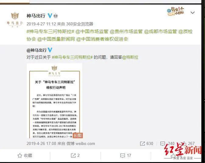 2019年4月28日,神馬的“維權(quán)行動(dòng)”再升級(jí),神馬專車成都分公司代表攜行程管家,手持3塊廣告牌前往@特斯拉 成都遠(yuǎn)洋太古里體驗(yàn)中心,對(duì)話特斯拉門店相關(guān)負(fù)責(zé)人,現(xiàn)場(chǎng)宣讀并遞交維權(quán)信。