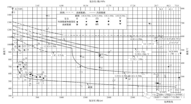 圖1 臨氫作業(yè)用鋼防止脫碳和微裂的操作極限
