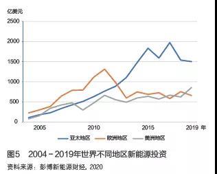 聚焦今后能源轉(zhuǎn)型和發(fā)展的方向,為了更好地解釋各國對(duì)于新能源不同的態(tài)度與意愿,本文將投資數(shù)據(jù)作為主要觀測(cè)值。在2004-2019年的16年觀測(cè)期中,全球新能源投資額總體呈波動(dòng)上升趨勢(shì)(見圖4)。2017年達(dá)到峰值3225億美元,超過2004年的7倍。從增速上看,隨著基數(shù)變大,總體趨勢(shì)逐漸放緩。但根據(jù)每年具體情況的不同,同時(shí)也受投資周期性的影響,不同年份會(huì)有所波動(dòng),多數(shù)年份維持正增長,并且半數(shù)年份增速超過10%,整體發(fā)展迅猛。2004到2007年為高速增長期,增速連續(xù)三年超過40%,2008年開始受金融危機(jī)影響,全球投資收緊,增速滑坡到21%,并于2009年出現(xiàn)了第一次負(fù)增長,但次年開始反彈。2012年后,歐洲新能源的發(fā)展已經(jīng)進(jìn)入了相對(duì)成熟期,《京都議定書》第一承諾期到期,同時(shí)由于歐債危機(jī)的持續(xù)影響,歐洲各國紛紛縮減新能源補(bǔ)貼,導(dǎo)致新能源投資大幅下滑,拉低了全球投資總量。經(jīng)過3年的調(diào)整,全球新能源補(bǔ)貼普遍削減,歐洲和美洲地區(qū)的投資水平趨于穩(wěn)定,亞太地區(qū)取代歐洲地區(qū),成為投資增長的主要來源,世界新能源發(fā)展進(jìn)入理性增長期。