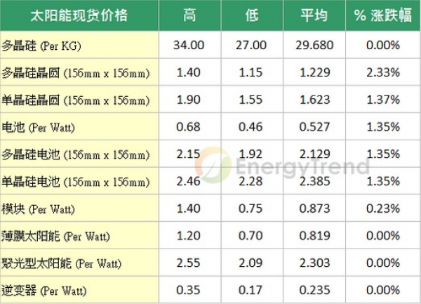 在本周現(xiàn)貨報(bào)價(jià)部分,目前多晶硅價(jià)格持平,平均價(jià)位仍維持在29.68美元/公斤;在硅片方面平均價(jià)格仍持續(xù)上揚(yáng),多晶硅片平均價(jià)格漲至1.229美元/片,漲幅為2.33%;單晶硅片平均價(jià)格小漲至1.623美元/片,漲幅為1.37%。