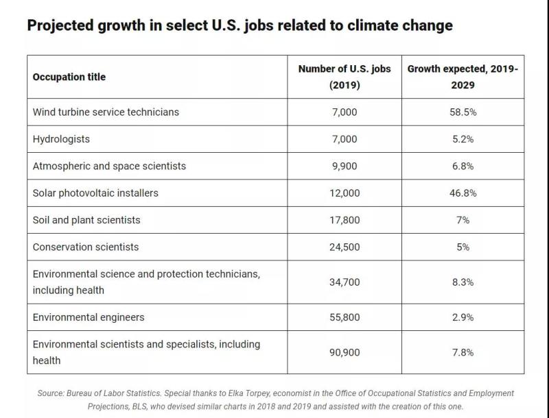 據(jù)美國勞工統(tǒng)計(jì)局的數(shù)據(jù),預(yù)計(jì)2029年前,一系列與氣候有關(guān)的職業(yè)將快速增長: