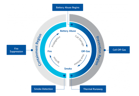 為了防止此類事件再次發(fā)生,了解電池故障的各個(gè)階段至關(guān)重要。可以劃分為預(yù)防和控制區(qū)域,并且分為四個(gè)階段: