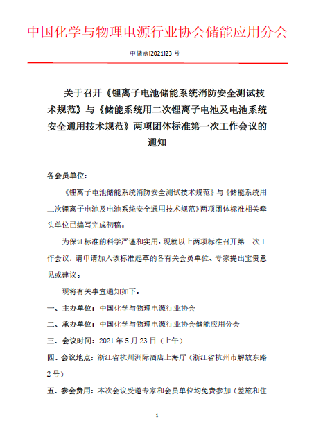 關(guān)于召開《鋰離子電池儲(chǔ)能系統(tǒng)消防安全測(cè)試技術(shù)規(guī)范》與《儲(chǔ)能系統(tǒng)用二次鋰離子電池及電池系統(tǒng)安全通用技術(shù)規(guī)范》兩項(xiàng)團(tuán)體標(biāo)準(zhǔn)第一次工作會(huì)議的通知